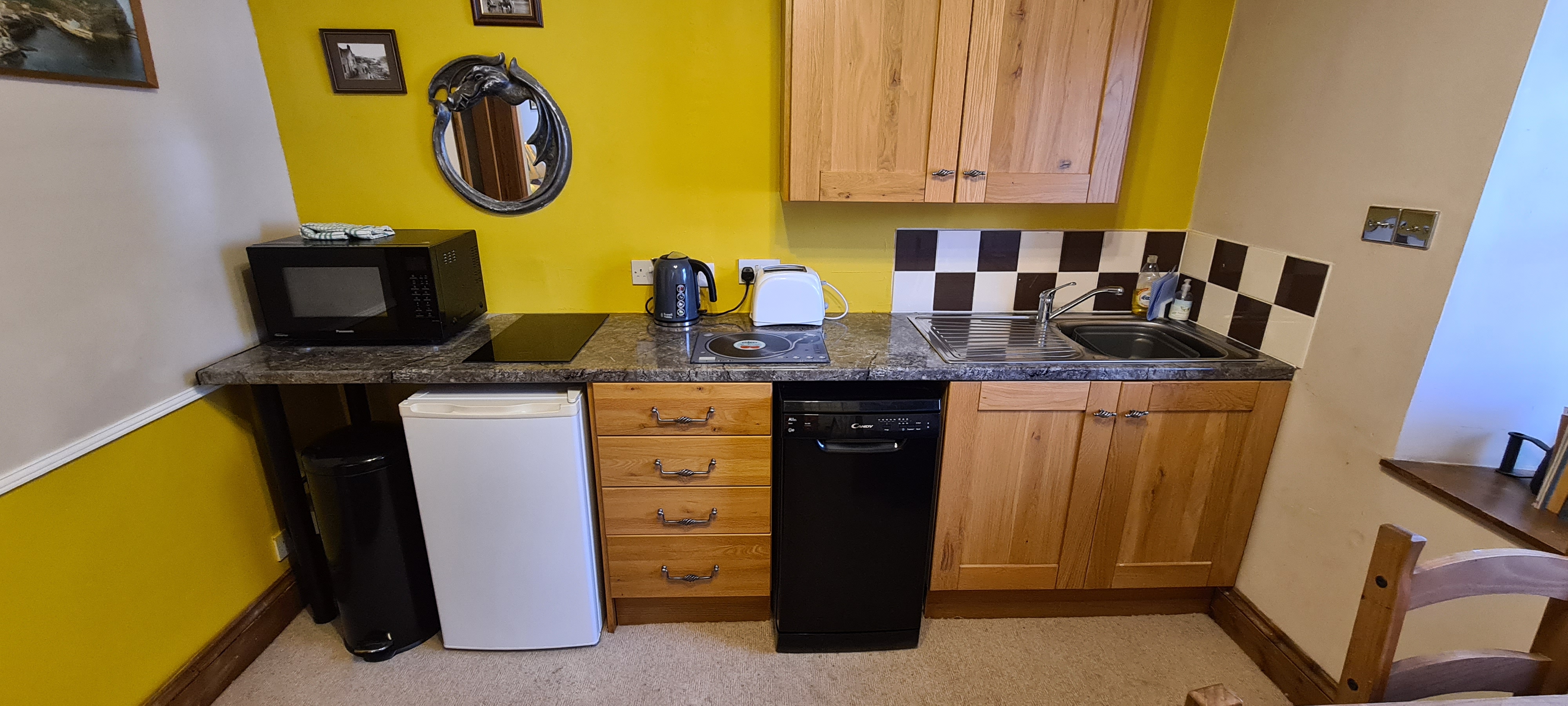 The open plan sitting-dining area has large windows, comfy sofas and a well-equipped kitchen. The bedroom with en suite shower room is warm and cosy with mood lighting and the beauty of stained glassed panels. There’s plenty of room to spread out but with central heating and flame effect fire the “Sanctuary” is as cosy as you'll ever need to escape the everyday. Make your own entertainment or dig out a game from the games / reading room. Relax.